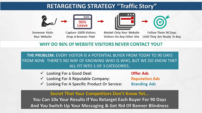 So what we found is that we can recapture that 96% of those departed visitors. We then send them messaging and follow up with them with branding ads, offer ads, and reputation ads over a 90 day period and get them to convert. So when they are ready to buy, you're in front of that 96% of missed opportunities to get them to convert.
